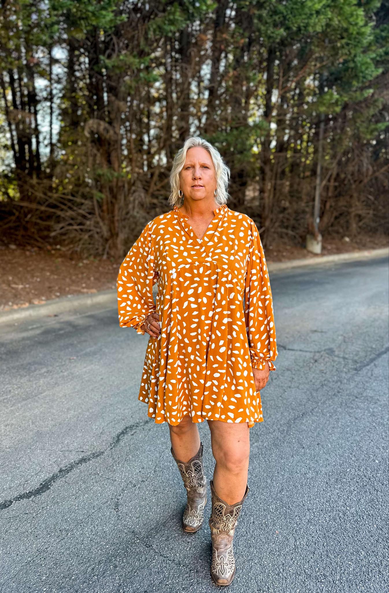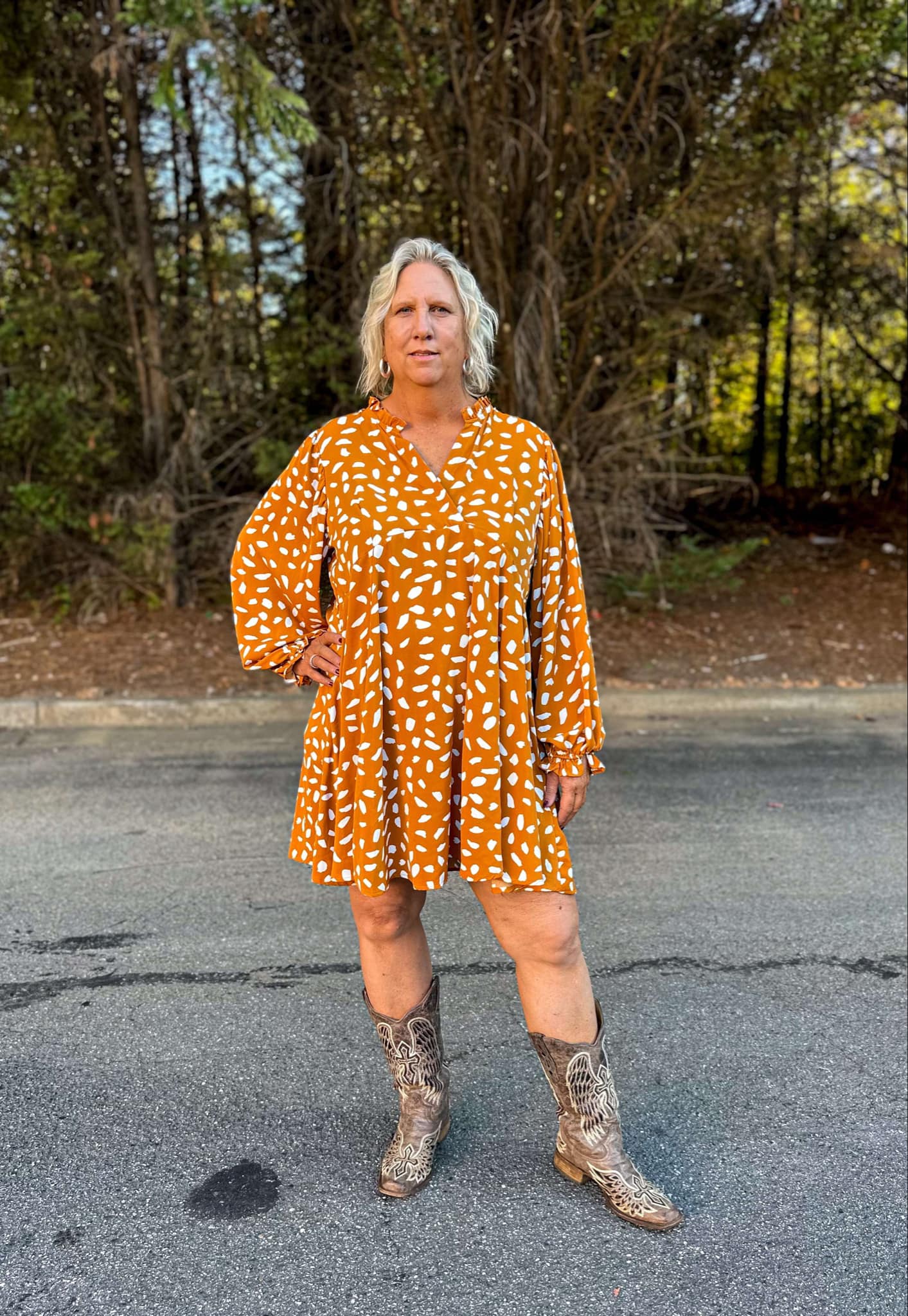 Strut your stuff in this BEAUTIFUL Animal Print Long Puff Sleeve Dress in Ochre Mix. Give yourself the confidence boost you've been craving. The flow of this dress makes it fun and exciting. You can dress it up or super fun and casual like pictured with our model. The possibilities are endless when you've got confidence on your side,