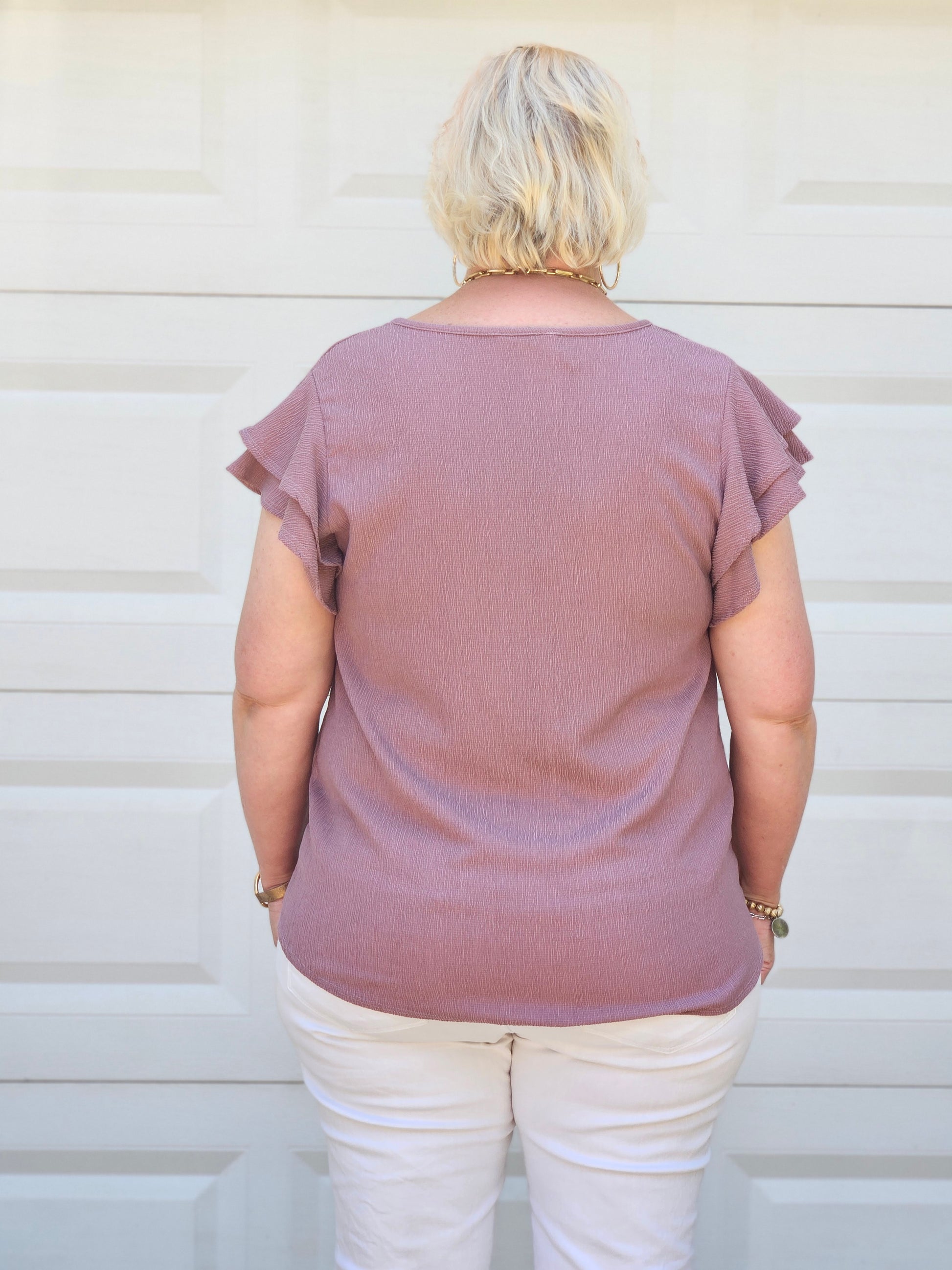 This beautiful mauve design is crafted with double ruffled sleeves, a classic round neckline, and a soft, crinkled fabric to give it a unique look.