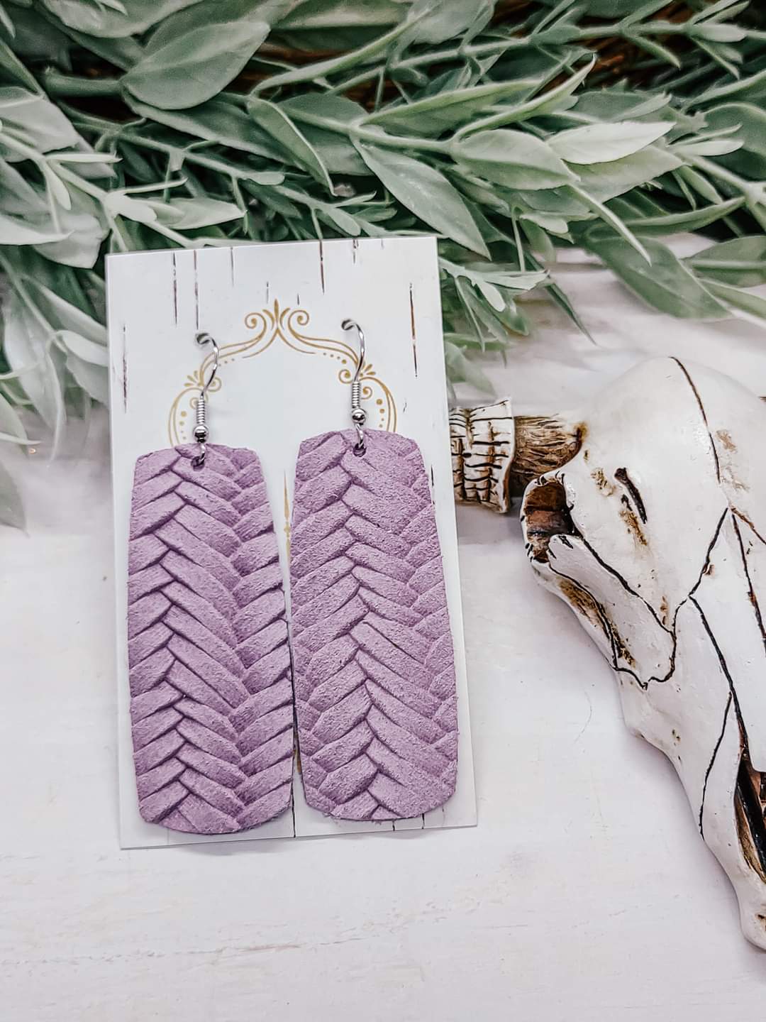 Fishtail Braided Genuine Italian Leather Wide Bar Earrings in Light Purple