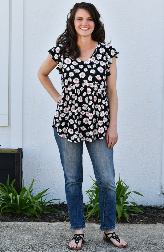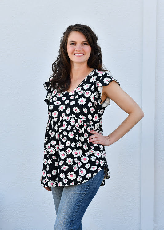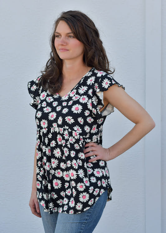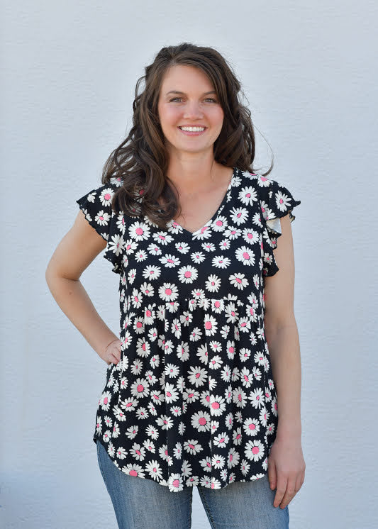 Daisy Floral Ruffle Sleeve Babydoll Top in Black & Pink