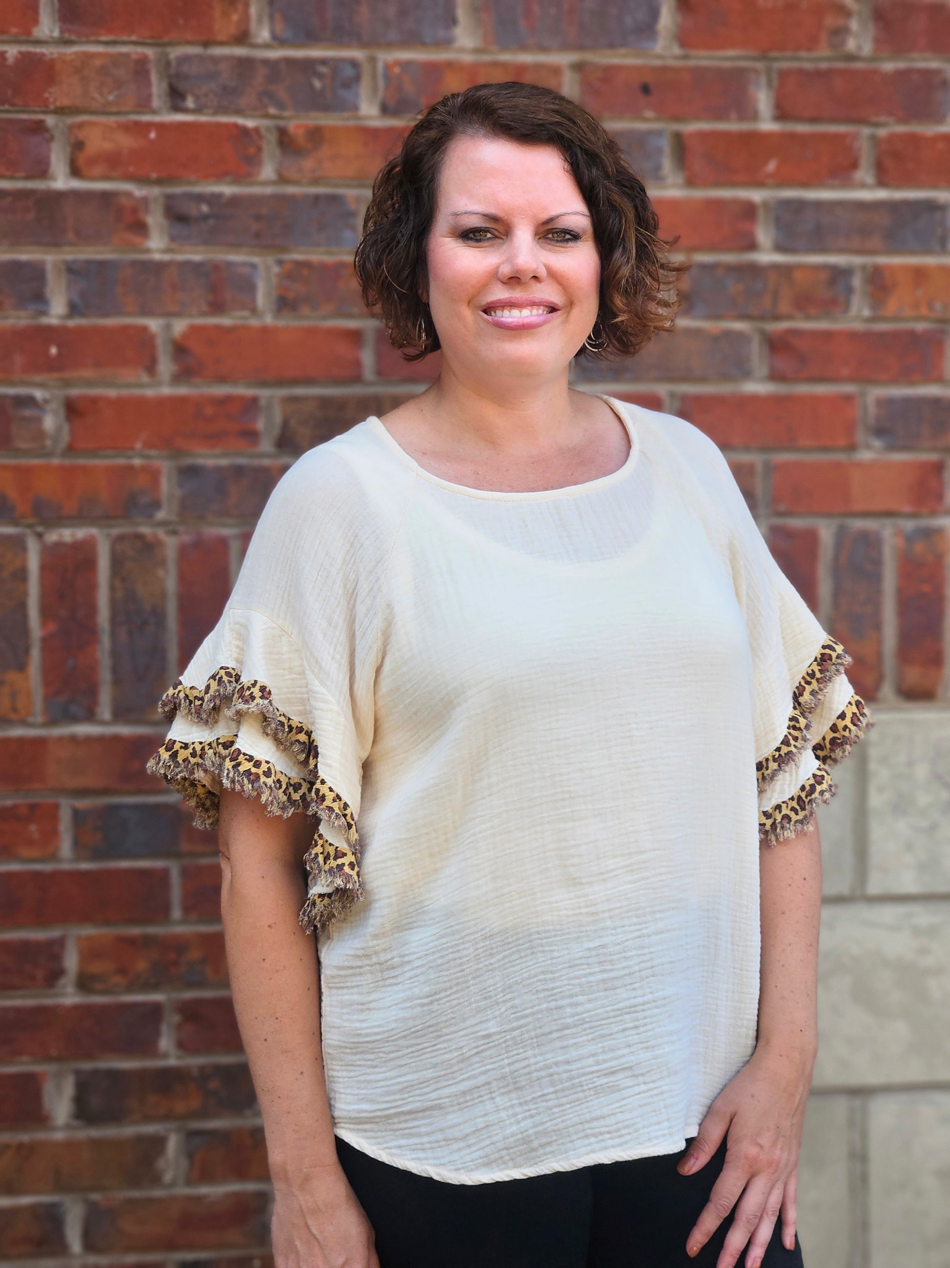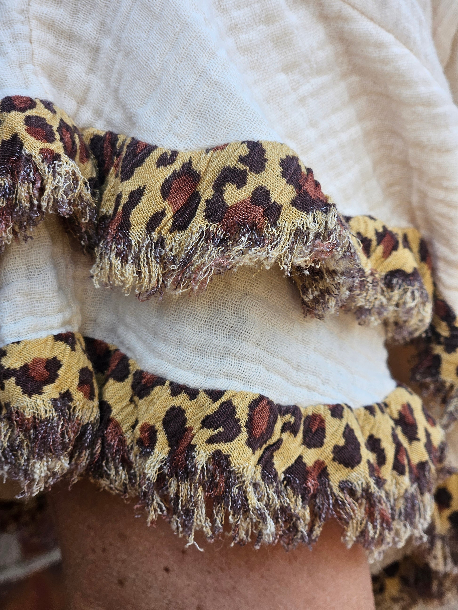 Indulge in the wild and romantic vibe of this Gauze Layered Animal Print Ruffle Top in Cream. Featuring a round neckline and animal print ruffled short sleeves with a frayed hem, this top exudes an effortless charm. Its lightweight gauze fabric offers a breezy feel, while the layered design adds a touch of sophistication. Perfect for any occasion, this top will elevate your style and make you stand out in the crowd. Get ready to turn heads and unleash your inner fashionista!