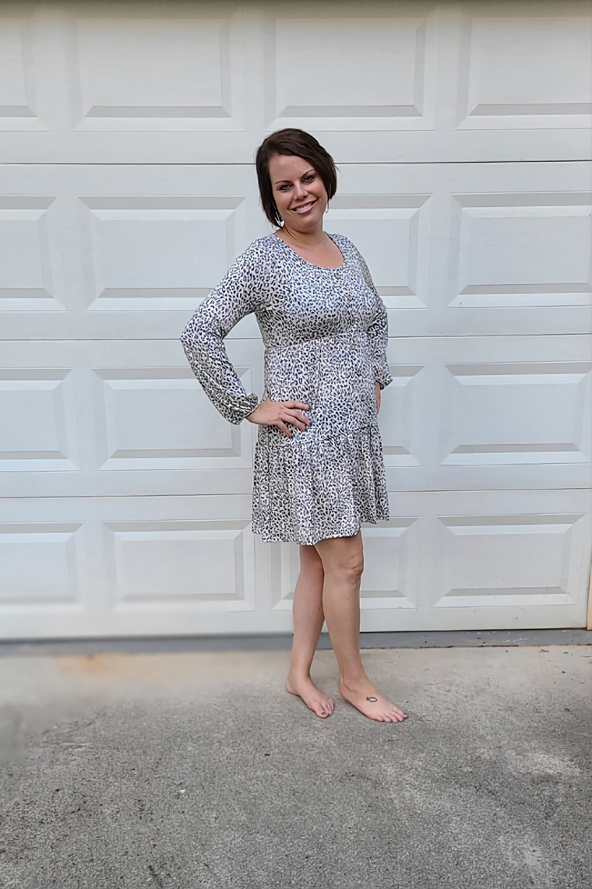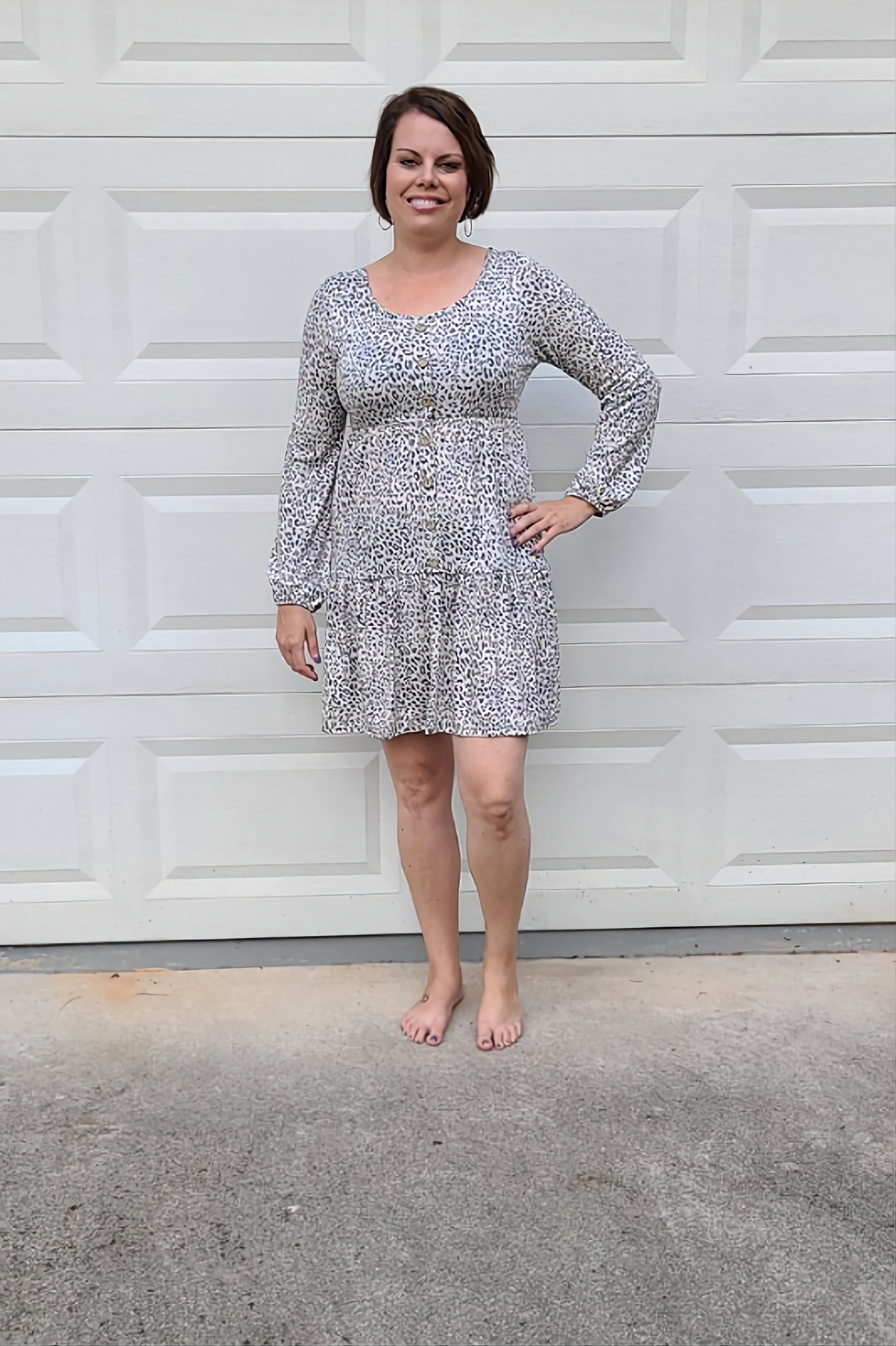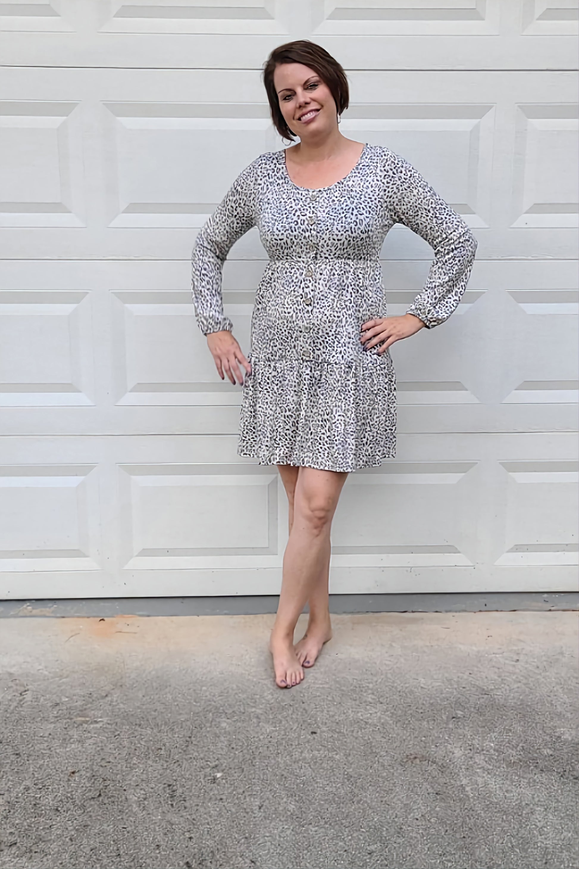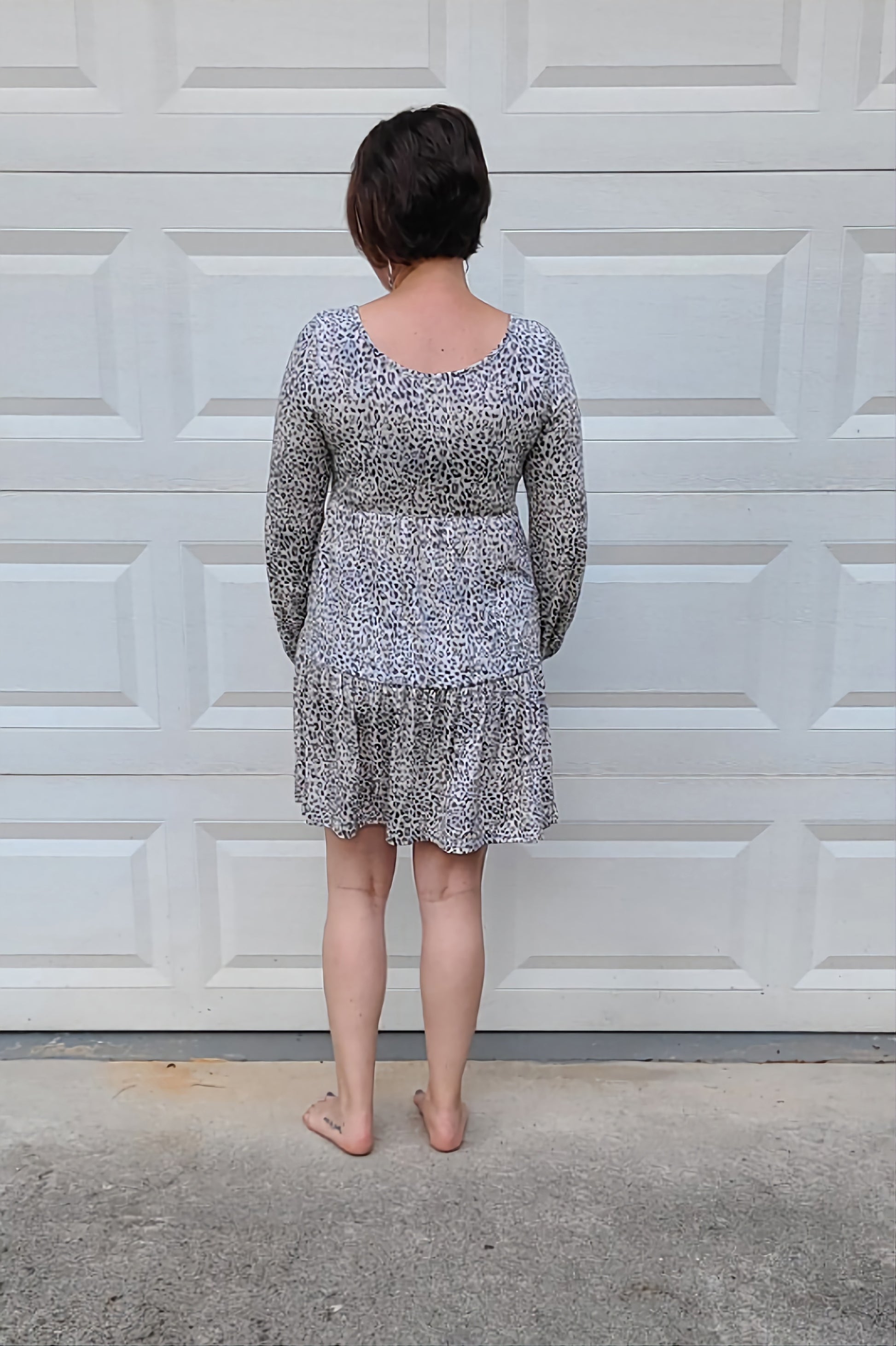 Leopard Print Long Sleeved Tiered Dress in Grey