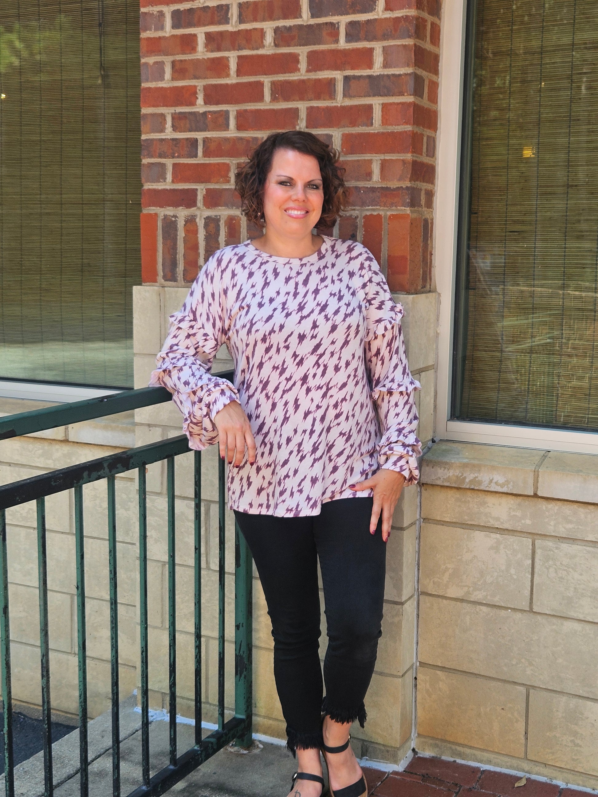 Long Puff Sleeved Multi-Print Top in Taupe/Burgundy