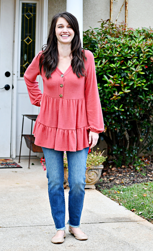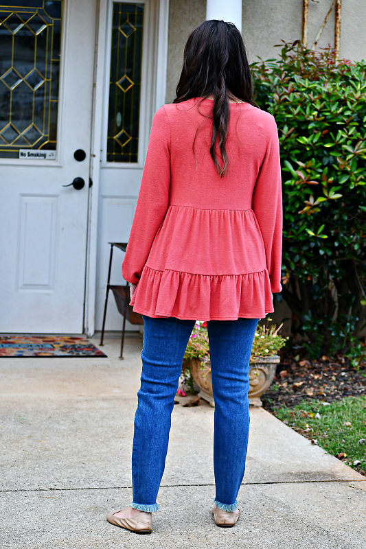 Long Sleeve Faux Button Empire Top in Marsala includes an elastic cuff, faux button front, empire waist, and a soft hacci brushed fabric. This on-trend top is designed to make you look and feel your best. Take a moment for yourself, and add a touch of Marsala style to your wardrobe.