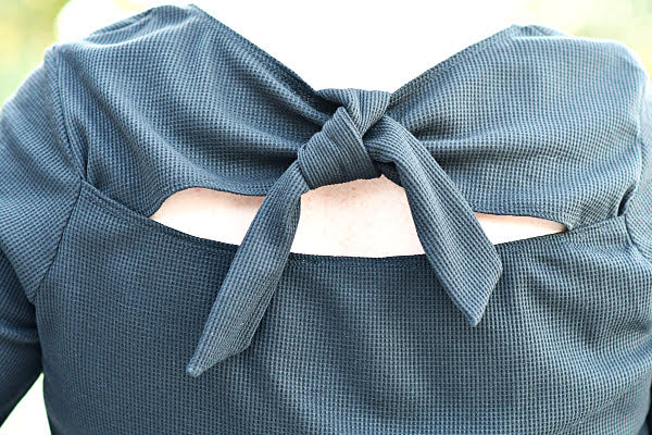 Keep it basic but beautiful in our versatile black top featuring lightweight brushed thermal knit material, cuffed sleeves, round neck, and a back keyhole with a bow. It is so soft and comfortable.