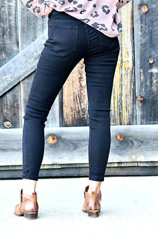 Mid Rise Pull On Crop Skinny Jeans in Black