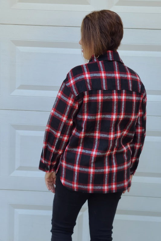 Plaid Button Down Shirt Jacket "Shacket" in Black/Red