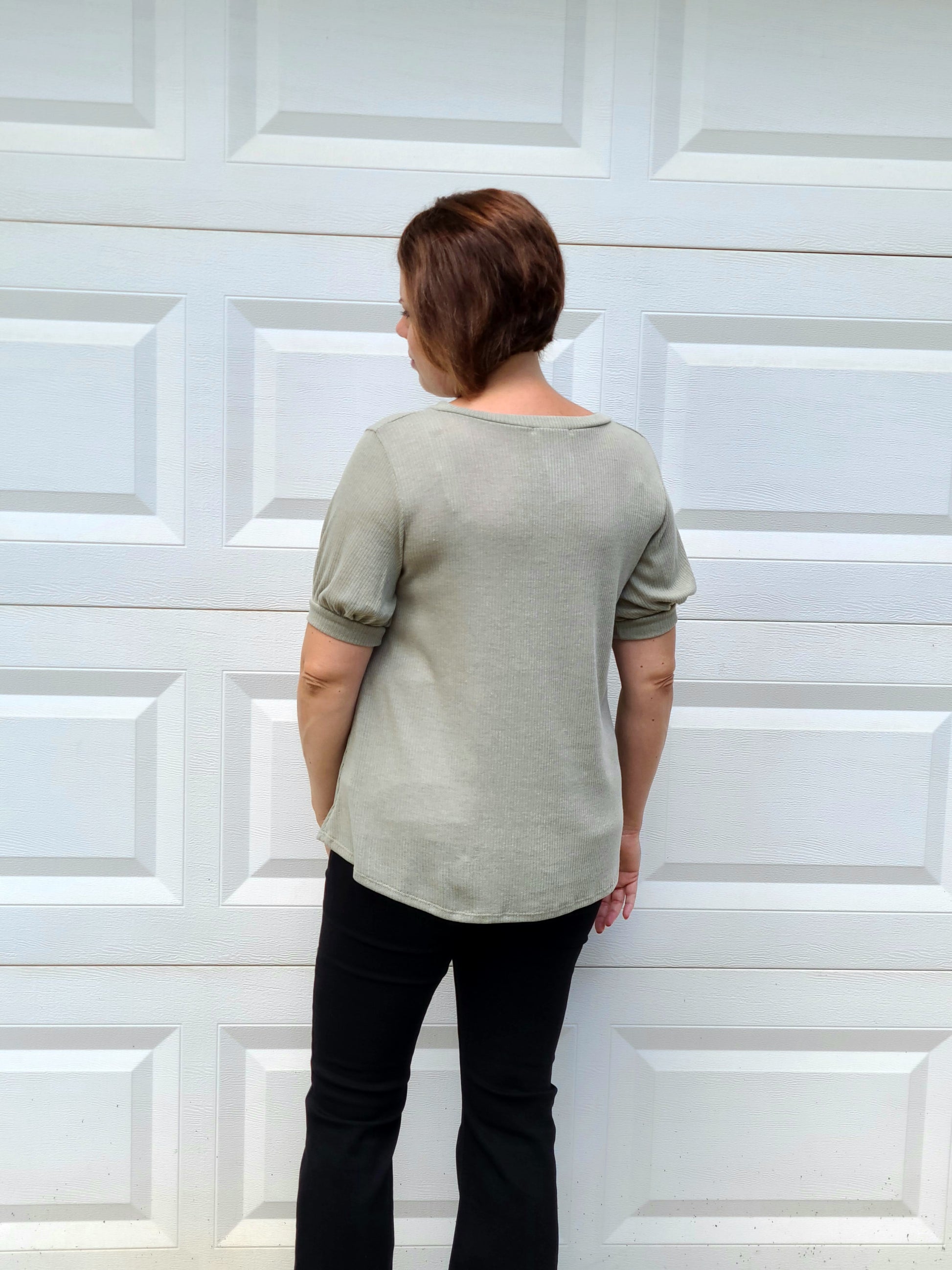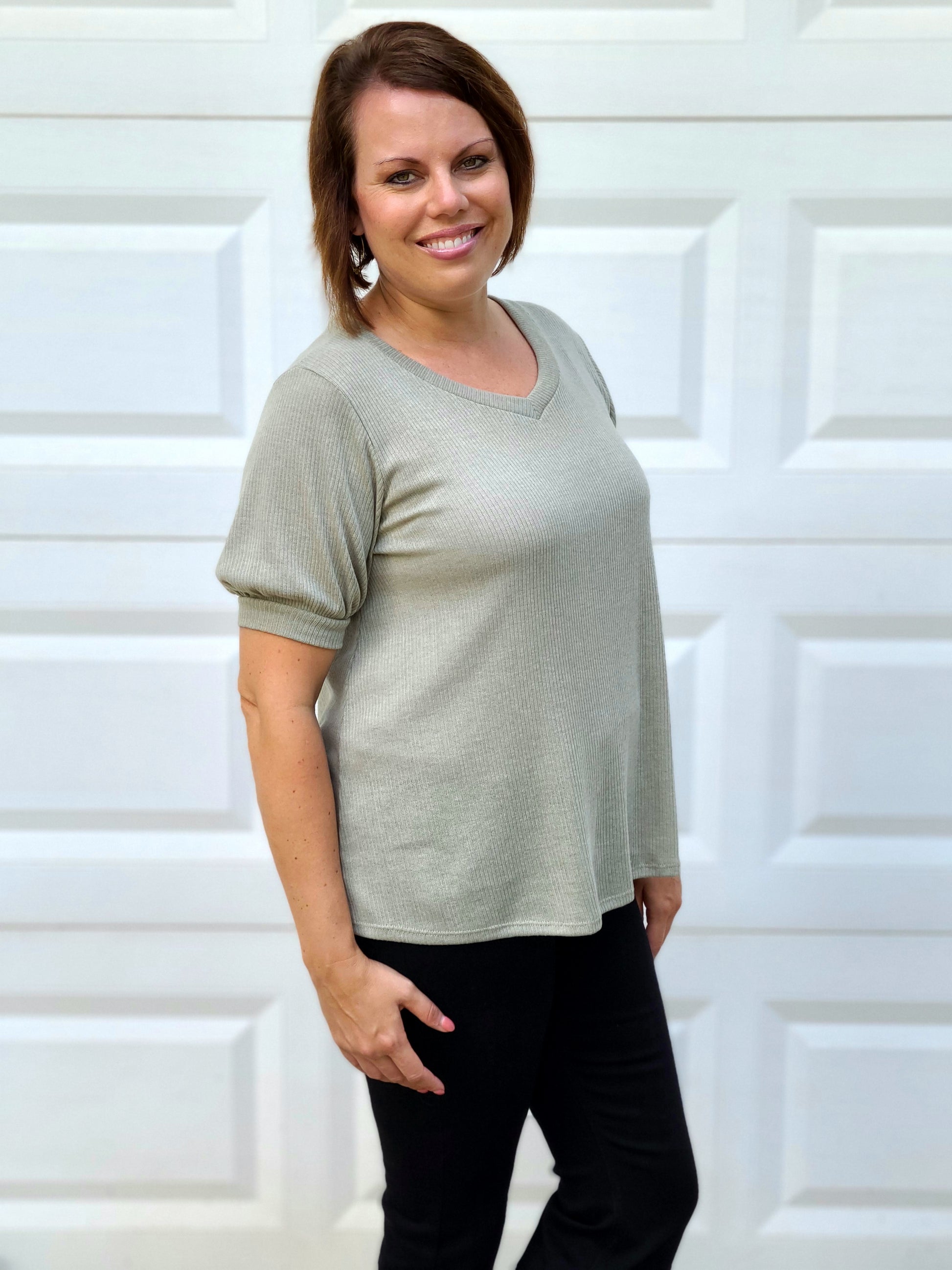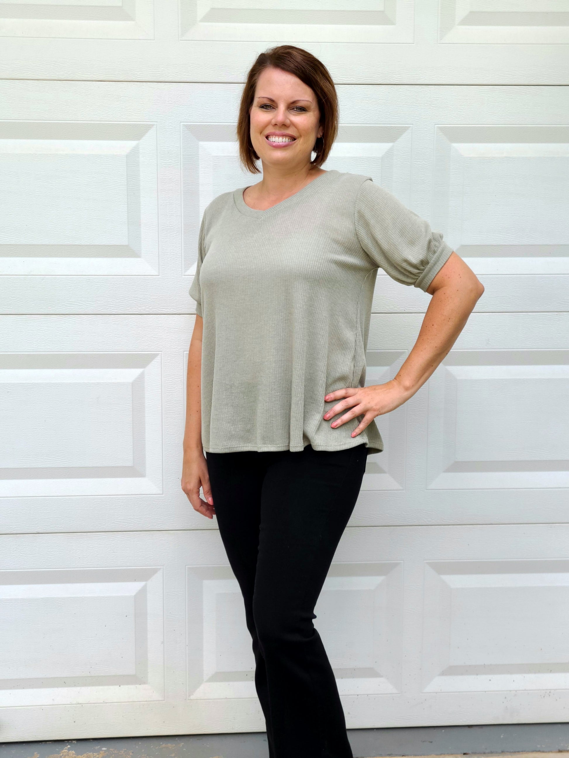 A fun twist to a basic top! This top is a ribbed lightweight, puff sleeve piece with a v-neck in a gorgeous green. A classic and comfy piece for running errands or an afternoon with your girls! Pair with your favorite denim and sneakers or dress it up with wedges!