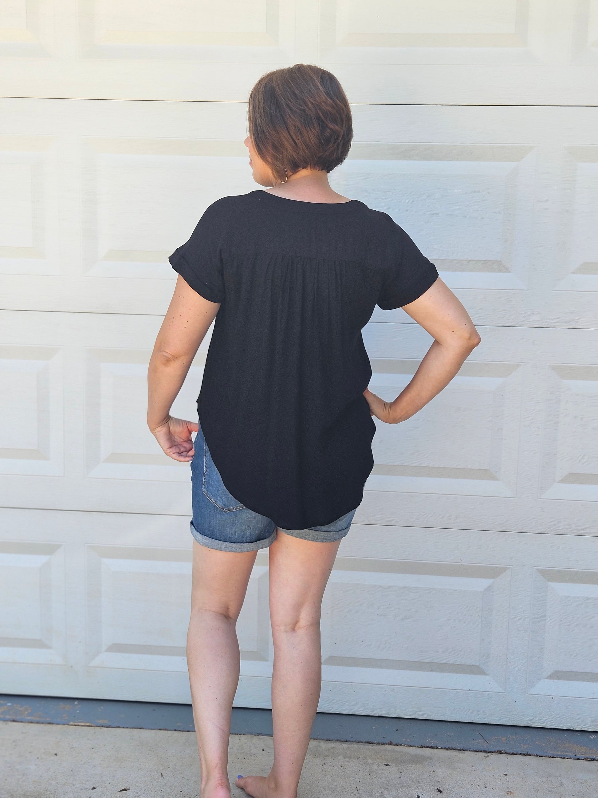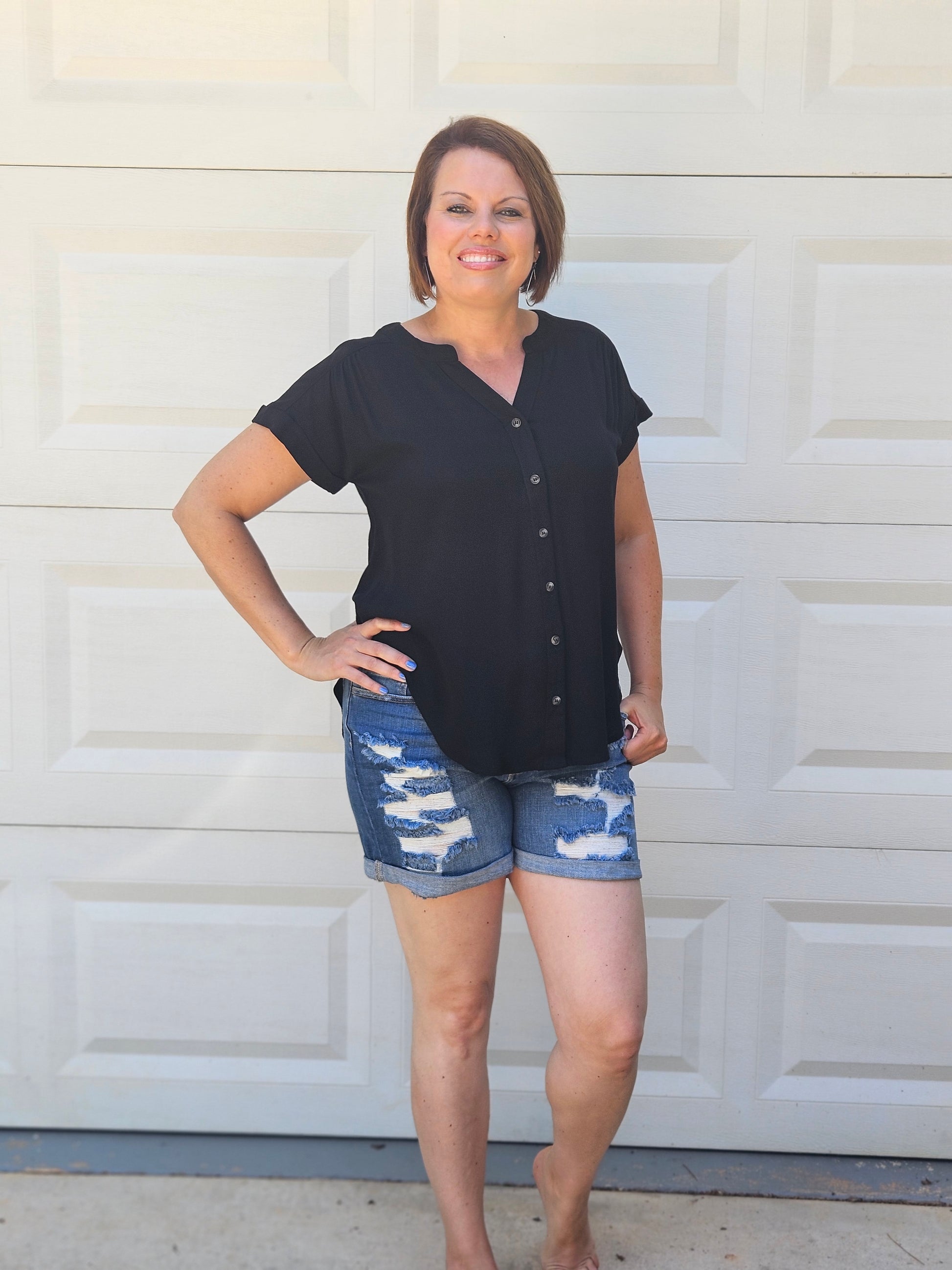 This color is EVERYTHING. It's a deep black and it's flowy! Jeans and your favorite pair of booties would look beautiful! If you are looking for a laid back summer vibe, pair it with these distressed shorts! This top includes a split round neckline, short sleeves, shirred shoulders, functional front buttons, and back yoke.