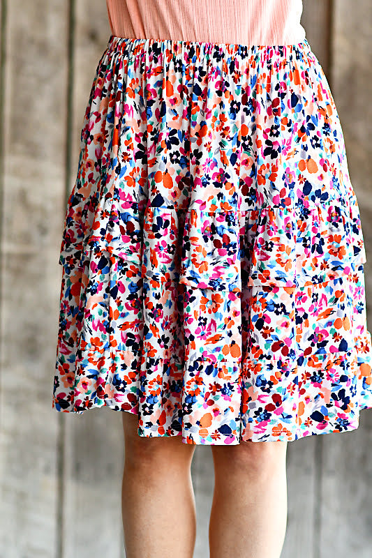 The design of this skirt is to DIE for! We are obsessed with the abstract details and colors thrown on here. So cute and fun. It features an elastic waistband, pockets, a tiered ruffled style, and a gorgeous floral print.