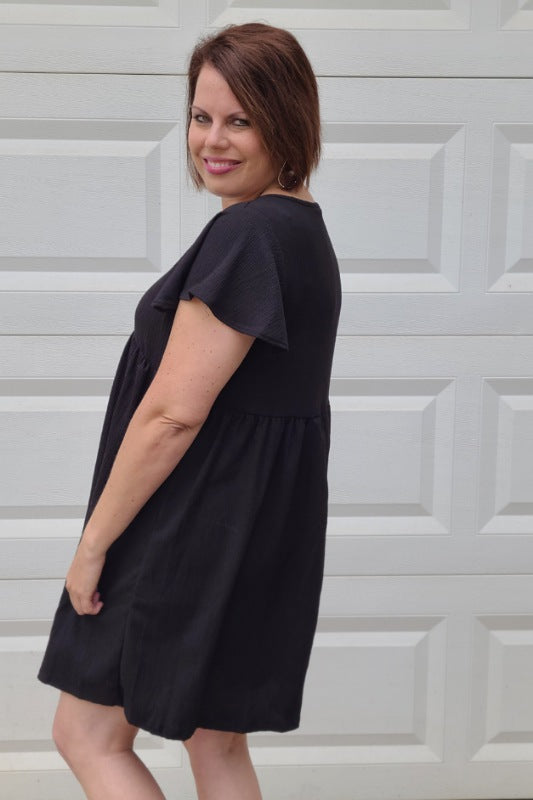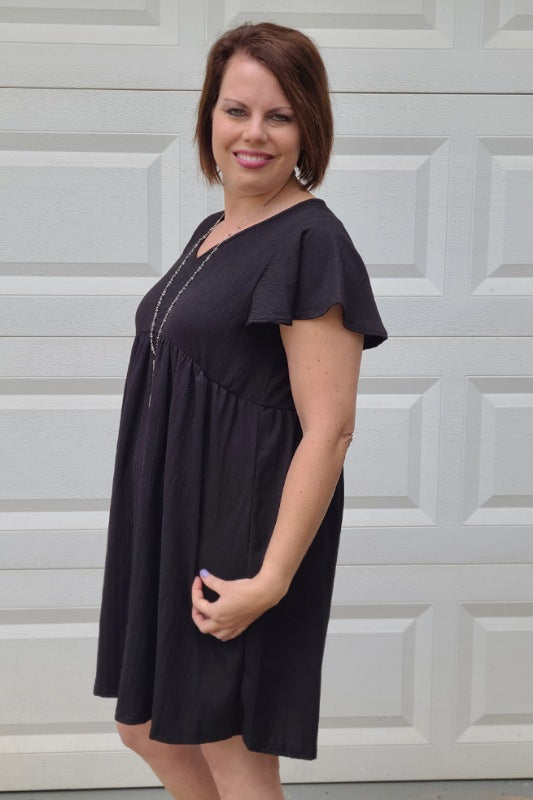 Do yourself a favor and make sure you get your hands on this dress! It's going to be a fabulous summer choice. It's the type of dress that you will always feel comfy and confident in! This dress features a v-neckline, scalloped short sleeves, shirred empire waist and lining and fabric is a lightweight crinkle knit.