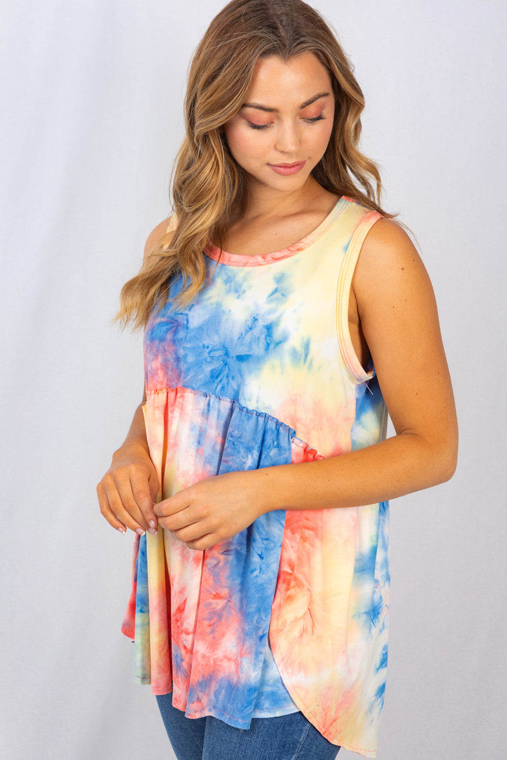 We are loving this tie dye top! It would pair perfectly with your favorite pair of shorts on nice summer day. This top includes a round neckline with reverse stitching, side slits and an empire waistline. The fabric is soft and comfortable.
