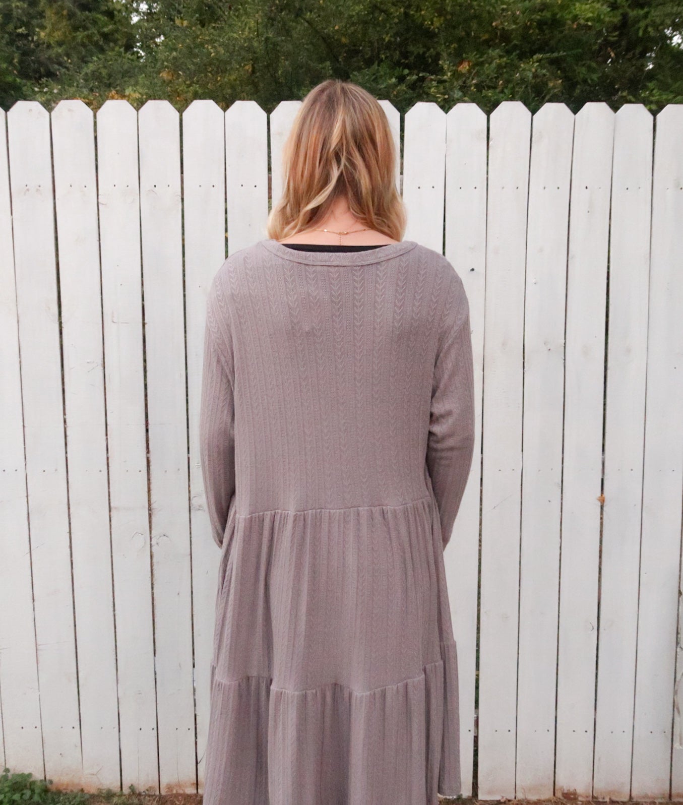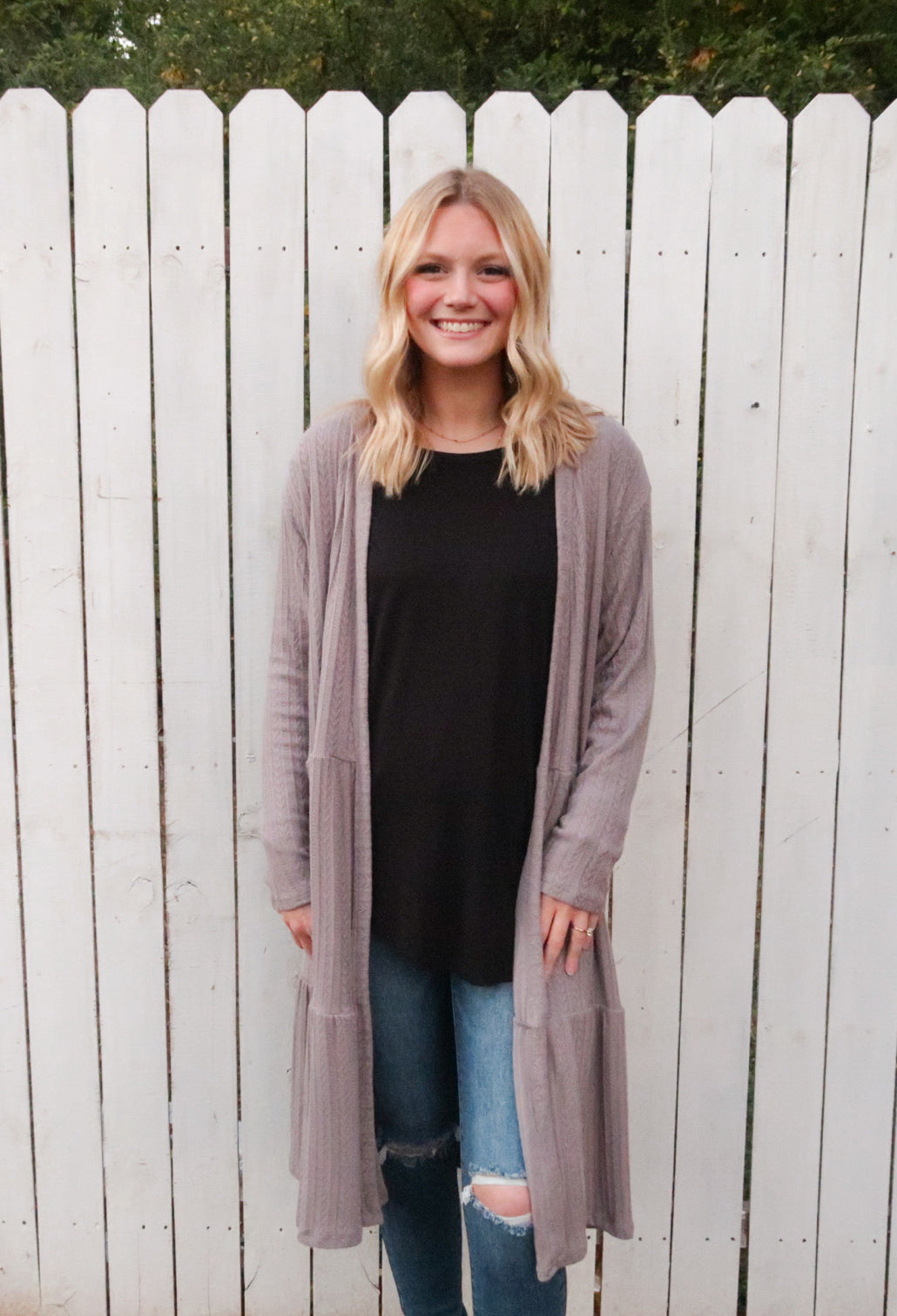 This color is everything! The all in one neutral bestie! Long, full of details, and soft color toned. Our Tier Long Sleeve Duster Cardigan in Silver includes long sleeves, a tiered style, and has side pockets!