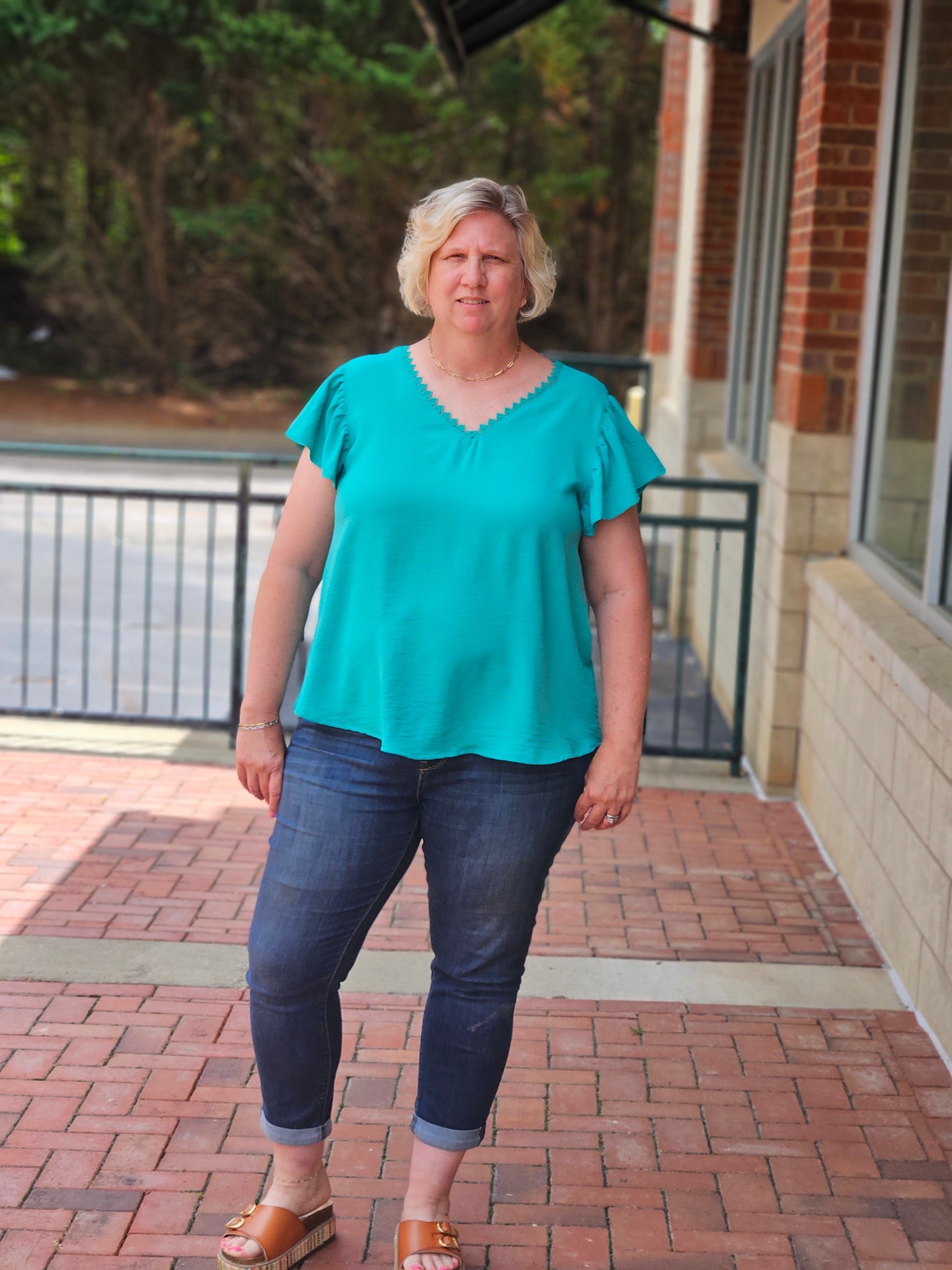 Experience effortless elegance in our V-Neck Ruffle Sleeved Top in Emerald! Featuring a delicate v-neckline with lace trim and charming short ruffled sleeves, this top is sure to turn heads. The lace yoke on the back adds a touch of femininity and grace, making it a must-have addition to your wardrobe. Elevate your style with this stunning top!